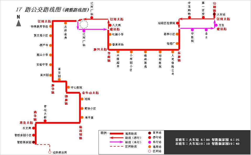 火車站—遼河大街—東新路—新興大街—學(xué)府路—遼河大街—市委廣場—遼河大街—新華路—富安園北側(cè)道路—?jiǎng)?chuàng)新路—金牛山大街—體育館路—青花大街—清華路—智勝新家園(終點(diǎn)回返)—清華路—青花大街—體育館路—金牛山大街—?jiǎng)?chuàng)新路—富安園北側(cè)道路—新華路—遼河大街—市委廣場—建設(shè)街—學(xué)府路—新興大街—東新路—建設(shè)街—公園路—火車站。