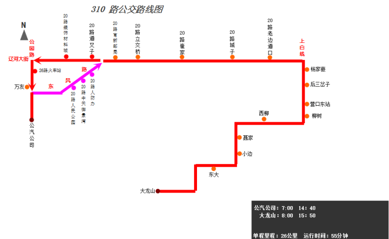 由公汽公司始發(fā),途經公園路、建設街東風路/遼河大街、遼河大街、營大路、上白線、營口東站路口、柳樹鎮(zhèn),終點到達大龍山